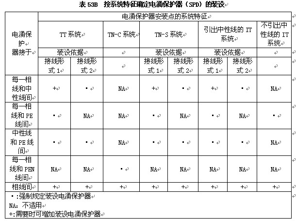 在電氣裝置的電源進線端或其附近裝設電涌保護器(SPD),安裝概況如附錄A至C所示,并符合表53B。