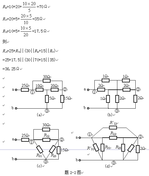 解 (a)將10Ω、20Ω、5Ω所連接成的星形等效變換成三角形,如圖(c)所示。其中