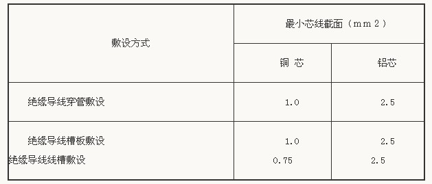 表 固定敷設的導線最小芯線截面