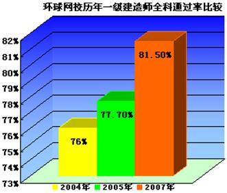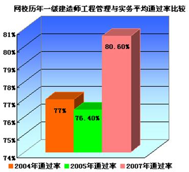 3、環球網校歷年一級建造師工程管理與實務平均通過率比較:三年的通過率分別為2004年的77%,2005年的76.4%和2007年的80.6%
