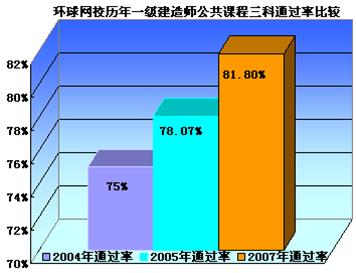 2、環球網校歷年一級建造師公共課程三科通過率比較:2004年一級建造師公共三科通過率為75%,2005年一級建造師公共三科通過率為78.07%,2007年一級建造師公共三科通過率更是高達81.8。