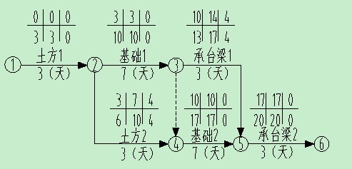 某辦公樓工程,建筑面積5500┫,框架結構,獨立柱基礎,上設承臺梁,獨立柱基礎埋深為1.5m,地質勘察報告中地基基礎持力層為中砂層,基礎施工鋼材由建設單位供應;A工程分為兩個施工流水段,組織流水施工,根據工期要求編制了工程基礎項目的施工進度計劃,并繪制施工雙代號網絡計劃圖,如下圖所示: