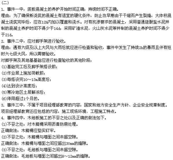 事件二:工程施工至結構四層時,該地區發生了持續兩小時的暴雨,并伴有短時6~7級大風。風雨結束后,施工項目負責人組織有關人員對現場腳手架進行檢查驗收,排除隱患后恢復了施工生產。