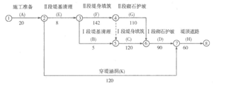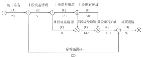 【解析】本案例第1問主要考查施工網(wǎng)絡(luò)計(jì)劃圖的繪制、工期計(jì)算及關(guān)鍵線路的判定。設(shè)計(jì)變更后,按先“Ⅱ堤段”、后“I堤段”順序組織施工,其他工作邏輯關(guān)系不變,各項(xiàng)工作持續(xù)時(shí)間不變,繪制新的施工網(wǎng)絡(luò)計(jì)劃圖。原計(jì)劃工期為:20+5+120+142+110+60=457(天),新計(jì)劃的工期為:20+8+142+120+90+60=440(天),新計(jì)劃的關(guān)鍵線路即工期最長(zhǎng)的線路,所以關(guān)鍵線路為:A→E→F→C→D→H。
