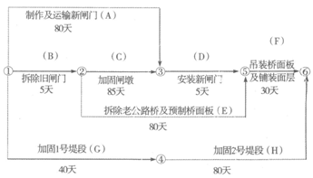 1.施工進(jìn)度計劃工期為125天;關(guān)鍵工作為B、C、D、F(或拆除舊閘門、加固閘墩、安裝新閘門、吊裝橋面及鋪裝面層)。