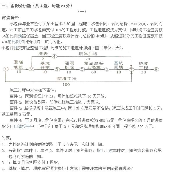 事件1是由于料場征地導致壩體加培工期延誤20天,責任在業主方,由于壩體加培處于非關鍵線路有總時差18天,因此對工期的影響為2天;