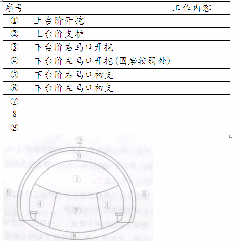 施工單位針對該項日編制了專項施工方案,其中包括工程概況、編制依據(jù)、勞動力計劃等內(nèi)容。擬采取二臺階開挖方法施工,施工順序如圖3所示,并按①-⑨的順序作業(yè)。針對該隧道施工過程中有可能出現(xiàn)突水安全事故的特點,編制了應(yīng)急預(yù)案。