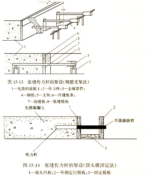 (1)傳力桿的固定安裝方法有兩種。一種是端頭木模固定傳力桿安裝方法。另一種是支架固定傳力桿安裝方法。兩種方法見圖示。
