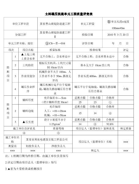 某省曹山湖堤防退建工程為3級,新建堤防填筑土料為粘性土,最大干密度為1.69g/cm3,最優(yōu)含水率為19.3%,設計壓實干密度為1.56g/cm3。該工程項目劃分為一個單位工程,5個分部工程。某省水利水電建筑安裝工程總公司承建該工程第Ⅱ標段,第Ⅱ標段為該工程的一個分部工程,堤防長度2.5km,土方填筑量50萬m3;其中編號為CS―Ⅱ―016的單元工程樁號為CS10+000~CS10+100,高程為?18.5m~?18.75m,寬度為40m,土方填筑量為1000m3.