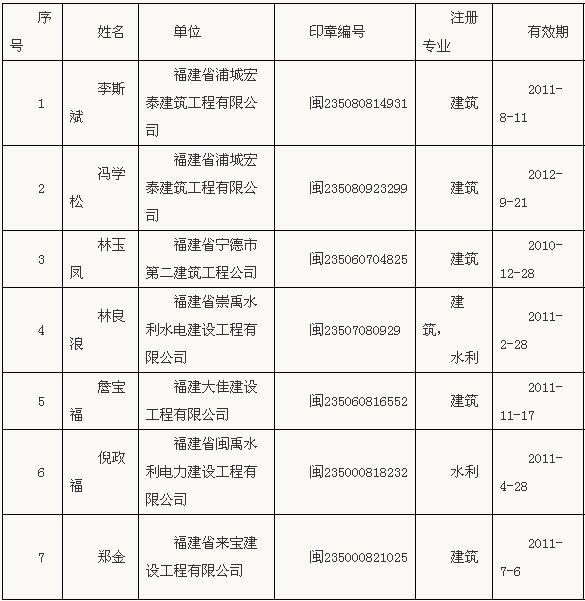 根據《關于首次開展二級注冊建造師(含臨時)延續注冊工作有關事項的通知》(閩建筑函[2013]75號)的有關規定,二級建造師(含臨時)首次延續注冊需提交執業印章,現有李斯斌等5位遺失注冊二級建造師執業印章,倪政福等2位遺失注冊二級臨時建造師執業印章(詳見附表),予以聲明作廢。