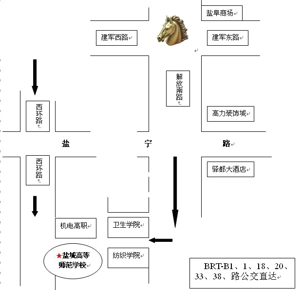 ②市區(qū)乘BRT-B1、1路、18路、33路公交車在鹽城高等師范學(xué)校(鹽城機(jī)電高職)站下車;