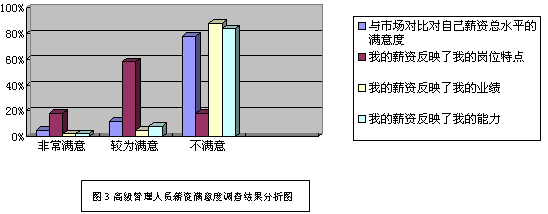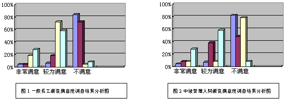 2、佳麗寶公司是由原來的三家企業合并而成的中型汽車配件企業。近些年來,該公司的經濟效益迅速提高,財務實力明顯增強。但由于領導層重視生產輕視管理,使公司各項管理的基礎工作十分薄弱,規章制度也不夠健全完善,特別是在人力資源管理方面,絕大部分員工對公司目前的薪資制度怨聲載道,嚴重地影響了公司生產經營活動的正常進行。為此,公司董事會決定對員工薪資制度進行一次全面調整。該公司目前一般員工實行的是技術等級工資制,采用計時工資加獎金(按月支付)的計酬方式,而管理人員實行的是職務等級工資制,按照職務高低支付工資,每個季度按照對各個部門的績效考評結果,支付一定數額的季度獎,其獎金水平不得超過一般員工獎金水平30%。圖1、圖2和圖3是一家管理咨詢公司對該公司員工薪資滿意度調查結果的分析圖。
