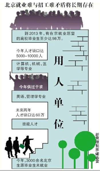 但是,目前高校畢業生在學歷結構、專業結構和技能結構上與市場需求存在較大差距。2011年,北京市計算機、機械、醫學等專業,人才缺口達到5000―10000人以上,而英語、管理學等專業則供過于求。