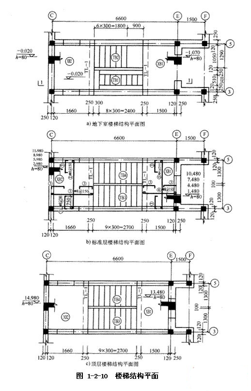 從圖中看出樓梯位于C~E與③~⑤軸線間,從地下室上到第一休息平臺(標高-1.070m)共有9級踏步,每步寬300mm;TBl、TB2分別是踏步板l、踏步板2的編號,從圖1-2-10a中看到TBl、TB2的長為2400mm,寬分別為1100mm,1170mm,其中TBl只在中間510mm范圍內有踏步,兩邊為斜平板。TLl表示支撐樓梯平臺板的平臺梁。XBl、XB2表示兩個休息平臺板,其標高分別為-1.070m,-0.020m,板厚h=80mm。在圖1-2-10b中畫出了平臺板XBl、XB2的配筋情況。