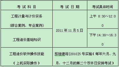 根據原自治區建設廳《廣西壯族自治區建設工程造價員從業資格管理暫行辦法》(桂建人[2009]11號)和《關于印發〈2011年度全區建設工程造價員資格考試及繼續教育工作座談會會議紀要〉的通知》精神,為做好全區2011年度全國建設工程造價員資格統一考試工作,現將有關事項通知如下: