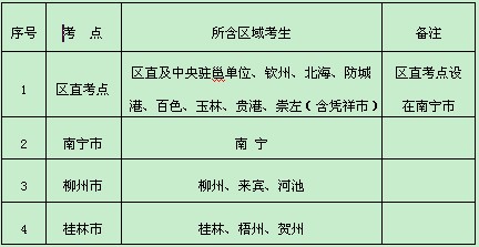 我區2011年度全國建設工程造價員資格考試(筆試)擬在南寧市、柳州市、桂林市三市設考點,具體設點情況以報名人數情況為準。各考點所含區域情況如下: