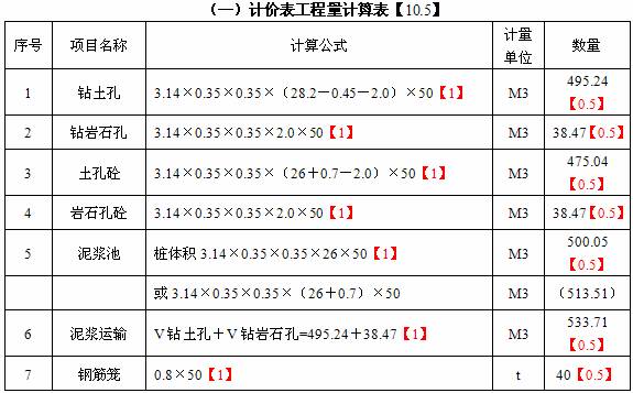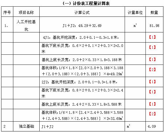 評分標準:人工挖基坑J1、J2中開挖深度、基坑下口寬度、基坑上口寬度計算正確各1分,計算公式使用正確及結果正確各2分,計10分。