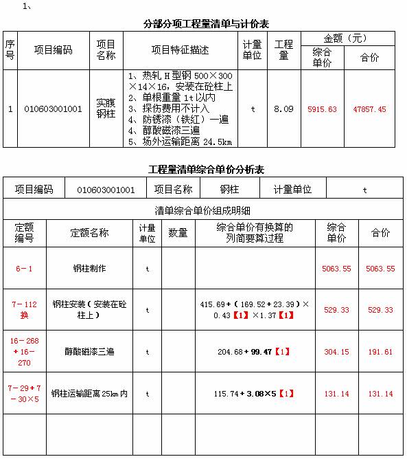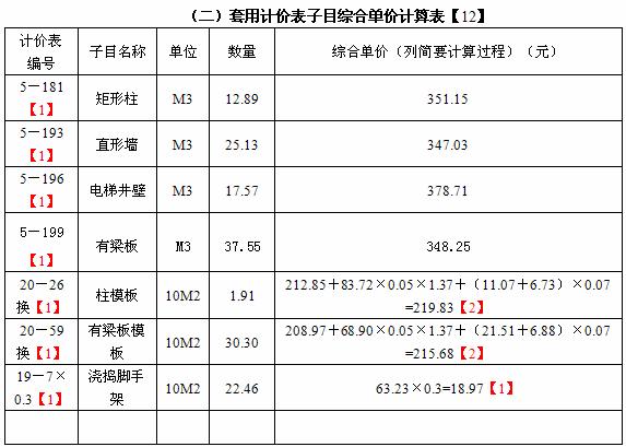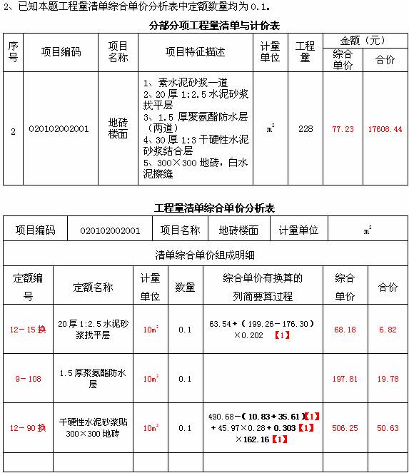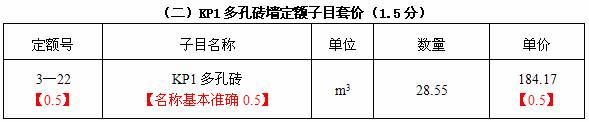 評分說明:定額號正確,每項得1分,應標未標注換時僅得0.5分;定額名稱正確,每項得0.5分;計量單位均正確得0.5分,否則不得分;定額數量均正確得0.5分,否則不得分;換算過程按題中得分點,共8分;定額綜合單價正確每項0.5分;清單綜合單價正確得0.5分,合價正確得0.5分。