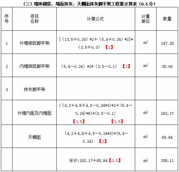 2、請按江蘇省04計價表計算與墻體砌筑、墻面抹灰、天棚面抹灰的腳手架工程量,并列出子目對應的定額編號。(注:計算腳手架時:內墻砌體高度、凈高:自室內地面至屋面板底;外墻腳手架按雙排外架子考慮。)