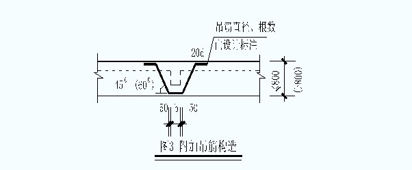 主次梁相交處在主梁上設2根附加吊筋(如圖3所示),附加吊筋長度計算公式為2×平直段長度+2×斜段長度+次梁寬度+2×50。