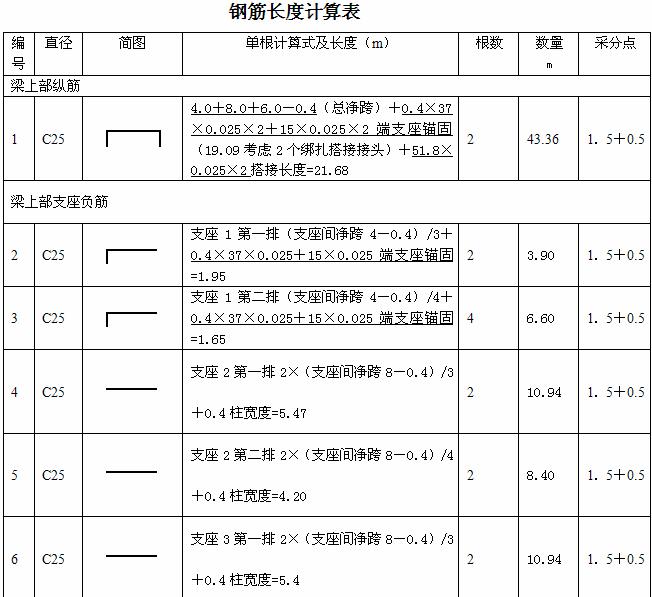 上部貫通縱筋、支座負筋、下部縱筋單根長度為1.5分,根數為0.5分,計24分。