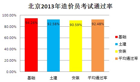 《工程造價基礎知識》:94.26%;《工程計量與計價實務――土建》:92.58%;《工程計量與計價實務――安裝》:90.59%;平均通過率:90.96%。