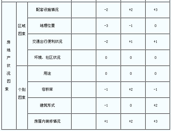 注:上表中房地產狀況因素是以估價對象為基準給出的,正(負)值表示可比實例的房地產狀況優(劣)于估價對象的房地產狀況導致的價格差異幅度。