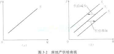 房地產供給曲線表示房地產的供給量與其價格之間的關系--某種房地產的供給量如何隨著該種房地產價格的變動而變動。在圖3-2(a)中,根據習慣,以縱坐標軸表示某種房地產的價格(P),橫坐標軸表示該種房地產的供給量(Q),因為在房地產價格較低時房地產的供給量減少,在房地產價格較高時房地產的供給量增加,所以得到的是一條向右上方傾斜的房地產供給曲線(S)。