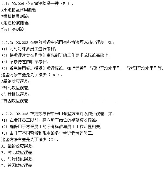 4.1:02.001 由管理者與每個員工一起確定特定的可檢測的目標,并定期檢查,對這些目標完成情況的績效評估方法是(B)。