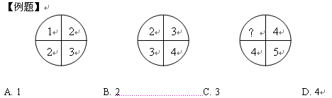 【解析】正確答案是3,根據前兩個圖形,可以看出規律為:1+3=2+2;2+4=3+3;因此,?+5=4+4。所以答案為C。
