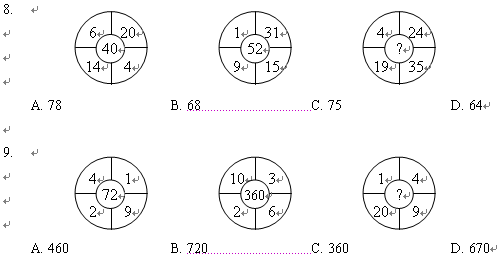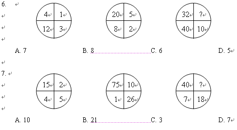(二)每題圖形中的數字都包含一定的規律,請你總結前兩個圖形中數字的規律,從四個選項中選出你認為問號應該代表的數字。