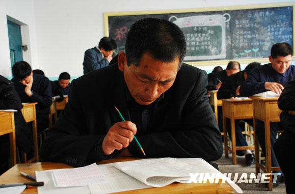 3月15日,在山東省公務(wù)員考試東營(yíng)實(shí)驗(yàn)小學(xué)考場(chǎng),來(lái)自東營(yíng)市基層的村支書(shū)參加山東省公務(wù)員考試。