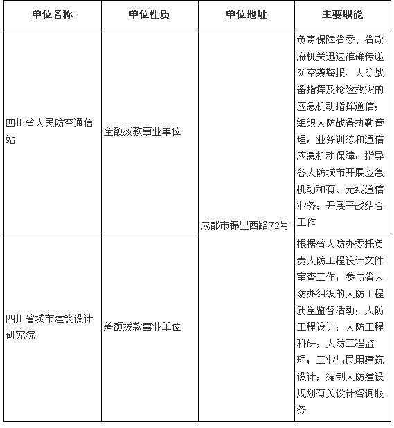 根據《四川省省屬事業單位公開招聘工作人員實施細則(試行)》的有關規定,四川省人民防空辦公室擬公開招聘部分工作人員補充到四川省人民防空通信站、四川省城市建筑設計研究院等2個直屬事業單位工作。