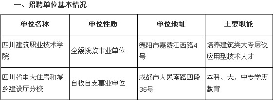 根據(jù)《四川省省屬事業(yè)單位公開招聘工作人員實施細則(試行)》的有關規(guī)定,四川省住房和城鄉(xiāng)建設廳擬公開招聘部分工作人員補充到四川建筑職業(yè)技術學院和四川省電大住房和城鄉(xiāng)建設廳分校等2個直屬事業(yè)單位工作。