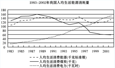 101.下列關(guān)于1983~2002年我國人均生活消費(fèi)能源量隨時(shí)間推移變化的分析不正確的是 A. 有明顯的上下波動的規(guī)律 B.沒有明顯的變化規(guī)律 C.總體上變化幅度較小 D.均值在120~130千克標(biāo)準(zhǔn)煤之間 102.下列說法正確的是 A.1983—2002年,我國人均生活消費(fèi)煤炭和電力的數(shù)量總體上存在此消彼長關(guān)系 B.1983—2002年,我國人均生活消費(fèi)煤炭和電力的數(shù)量不存在相關(guān)性 C.1983—2002年,我國人均生活消費(fèi)煤炭和電力的數(shù)量一直存在此消彼長的關(guān)系 D.1988年以來,我國各年人均生活消費(fèi)煤炭和電力數(shù)量的增減情況正好相反 103.1983—2002年,我國人均生活消費(fèi)電力數(shù)量的年平均增長量約為多少千瓦時(shí) A.5 B.6 C.7 D.8 104.圖中我國人均生活消費(fèi)煤炭數(shù)量下降最快的時(shí)段是 A.1988—1991年 B.1991—1992年 C.1992—1994年 D.1996—1998年 105.1983—2002年,我國人均生活消費(fèi)能源量的最高峰出現(xiàn)在哪一年 A.2002 B.1996 C.1988 D.1982 ·2010年公務(wù)員考試公共基礎(chǔ)輔導(dǎo) 更多信息請?jiān)L問:公務(wù)員頻道 公務(wù)員考試論壇 公務(wù)員博客圈