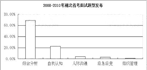 湖北公務員面試以結構化面試形式為主,包括自我認知、人際溝通、組織管理、應急應變和綜合分析等基本題型。根據對2008年―2010年 湖北公務員面試的真題進行分析,可得出湖北公務員面試題目類型分布如下: