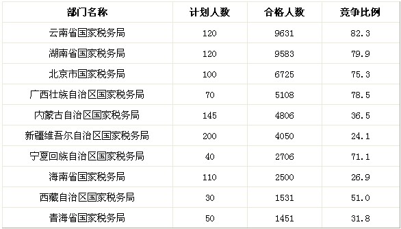 2011年國(guó)家公務(wù)員考試稅務(wù)部門報(bào)名合格人數(shù)為434298人,平均比例已達(dá)到86.4:1。相比于2010年的426609人,增加了7689人。稅務(wù)部門競(jìng)爭(zhēng)最激烈的部門是陜西省國(guó)家稅務(wù)局,比例為314.2:1。競(jìng)爭(zhēng)比例最小的稅務(wù)部門是新疆維吾爾自治區(qū)國(guó)家稅務(wù)局,競(jìng)爭(zhēng)比例為24.1 :1。