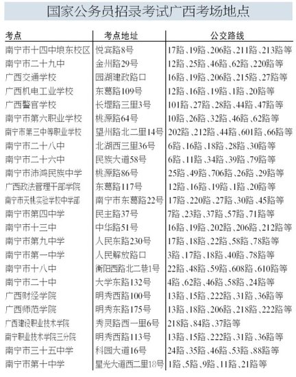 2012年國家公務員招錄公共科目筆試將于11月27日在全國各省會城市、自治區(qū)首府、直轄市和個別較大城市同時舉行。其中,上午9:00-11:00進行行政職業(yè)能力測驗考試,下午14:00-16:30進行申論考試。從11月21日10時起至26日12時,國家公務員考試報考人員可登錄所選考試地考試機構(gòu)網(wǎng)站,通過報名序號和身份證號自行查詢、下載并打印準考證。據(jù)悉,廣西的考場今年依然只設(shè)在首府南寧市的24個考點,具體考點安排考生可查看下圖: