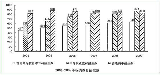 2004~2009年全國(guó)普通高等教育本專科招生數(shù)以及中等職業(yè)教育、普通高中招生數(shù)見(jiàn)下圖: