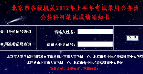 北京市各級機關2012年上半年考試錄用公務員公共科目筆試成績查詢入口
