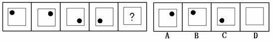 (答案:B。黑點在正方形中順時針移動。在第5個圖形中,應該正好移動到左上角。)
