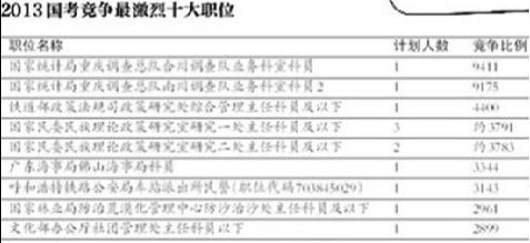 在重慶報名人數排名前十的崗位中,除了國家統計局重慶調查總隊合川、南川兩個崗位外,萬州區國稅局稅務所科員一職以1425人居第三位,江北區國稅局稅務所科員職位以560人居第四位,其余的被海關、郵政部門的部分崗位所占據。這些部門都是常熱部門,查看這些職位雖都有一定的專業限制,但都未有工作經驗等要求,因此吸引了不少應屆畢業生報考,成為熱門。