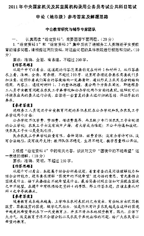 2011年國(guó)家公務(wù)員考試申論真題(地市級(jí)及以下)答案解析