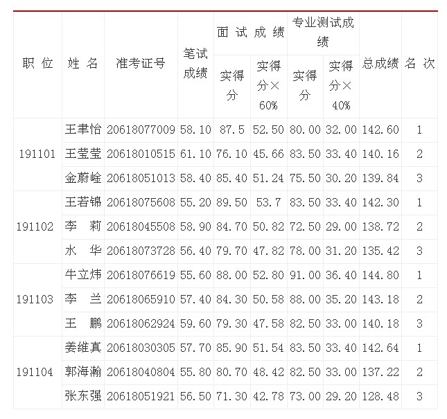 考試總成績=筆試成績+面試成績×60%+專業知識測試成績×40%。
