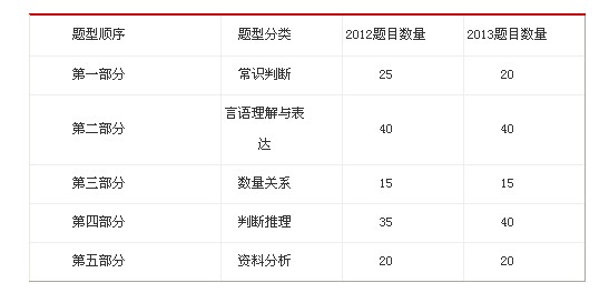 今年的行測試題在題型順序方面沒有明顯變化,依舊和2012年的順序保持一致,分別為常識判斷、言語理解與表達、數量關系、判斷推理、資料分析五大模塊。題量與去年持平,共計135道,但也出現了一些細微的調整。