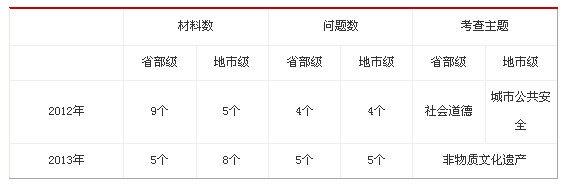 2013年國考申論部分地市級依舊延續往年的出題模式,先給定一定數量材料,隨后設置相應問題。從主題來說,省部級和地市級不約而同從宏觀上考查了科學發展觀,微觀上則著重考查了非物質文化遺產問題。與2012年考查的情況對比如下: