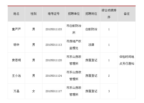2012年宜昌市房產管理局招聘工作人員體檢名單