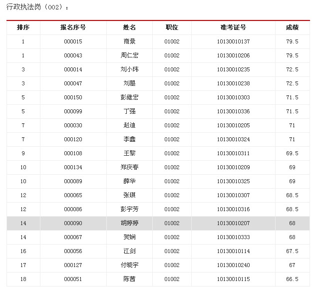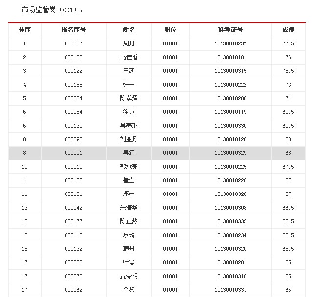 根據《省工商局公開遴選公務員公告》,按筆試成績從高到低的順序以及面試和遴選職位6:1的比例,周丹、高佳雨、王凱、張一、陳孝輝、涂嵐、吳春琳、劉亞丹、吳霜、郭承亮、崔瑩、鄧莽、朱清華、陳正然、蔡玲、韓丹、葉敏、黃令明、余黎等19人進入市場監管崗(001)職位面試,商景、周仁宏、劉小瑋、劉?、彭繼宏、丁強、趙迪、李鑫、王黎、鄭慶春、薛華、張琪、彭宇芳、胡婷婷、賀嫻、江劍、付曉宇、陳茜等18人進入行政執法崗(002)職位面試。請上述考生在12月15日上午面試前將身份證、準考證、紙質遴選報名登記表、誠信承諾書、學歷學位證書、工作經歷證明等材料原件及公務員登記表復印件(復印件上需加蓋單位人事部門紅章)交候考室工作人員。