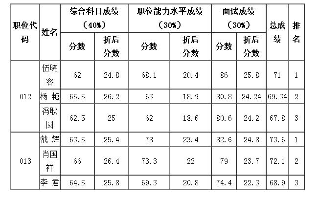 省商務廳2012年度公開遴選公務員面試工作于12月1日結束,現將面試成績和三項(筆試、職位水平能力測試、面試)綜合成績公布如下: