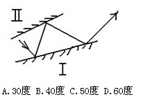 兩反射鏡面I、II成5度角放置,光線入射鏡面I的入射角為30度,然后在兩個鏡面中來回反射,則光線第一次從鏡面I上重新反射出來的出射角為________。